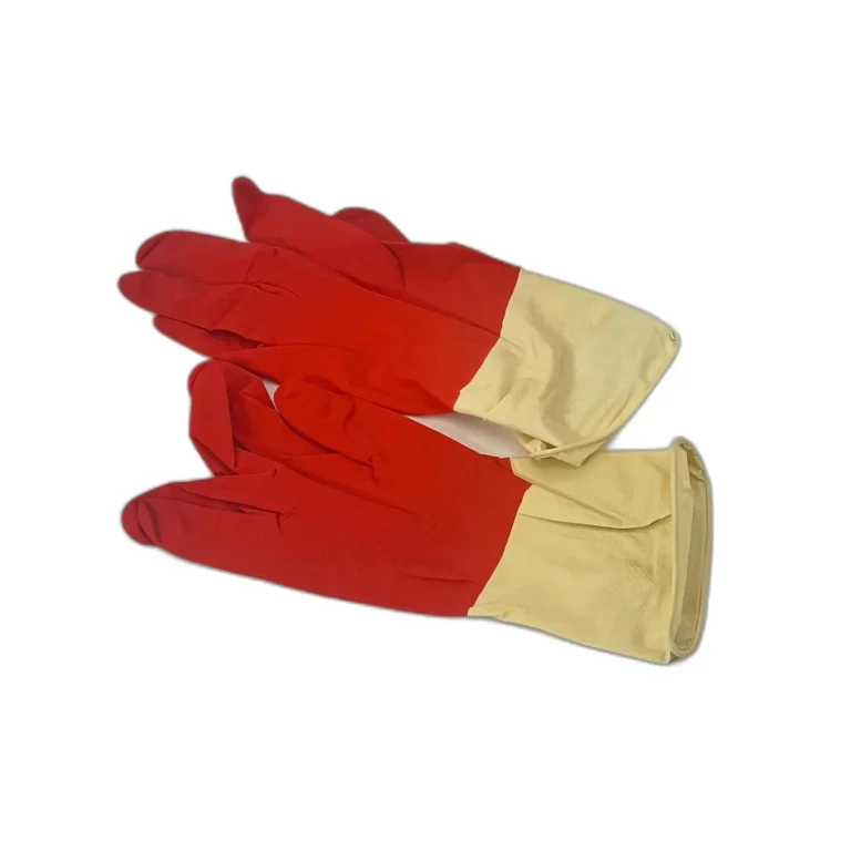 Manusi de menaj bicolore rosu-crem, reutilizabile si confortabile, ideale pentru protectia mainilor in activitatile casnice.