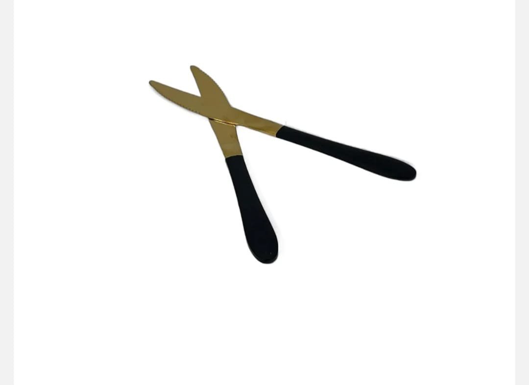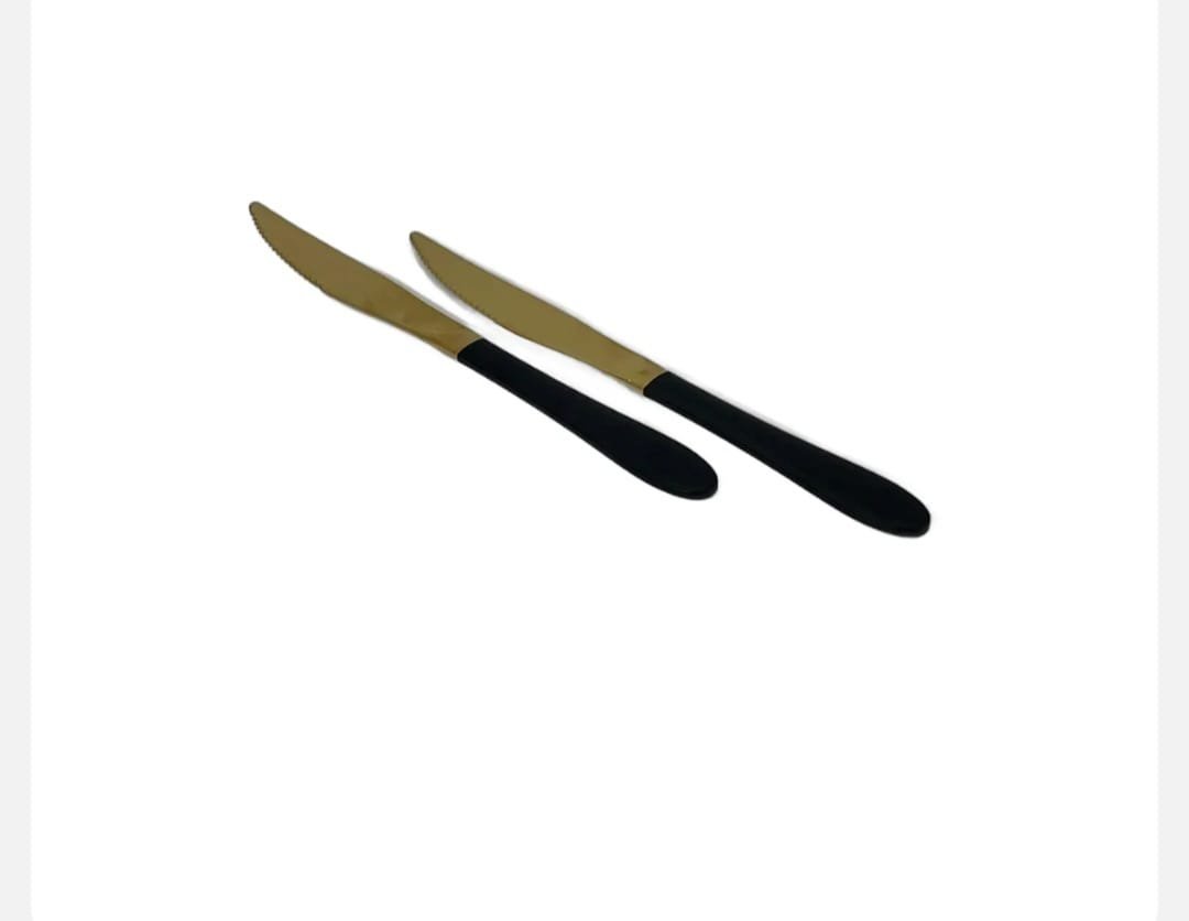 Set de 2 cutite elegante, lungime 22.5 cm, cu lama aurie si maner negru mat. Ideal pentru servire festiva sau completarea tacamurilor moderne.