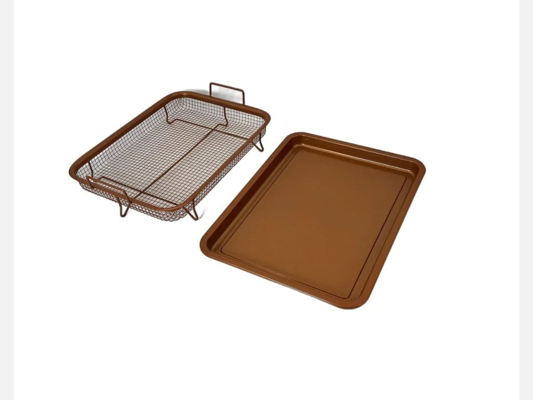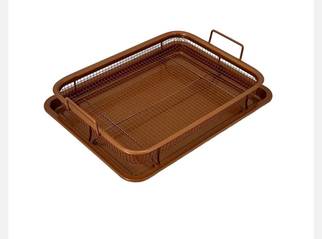 Set format din tava de scurgere si cos tip air fryer, dimensiuni 33×24 cm, ideal pentru gatit crocant in cuptor, fara ulei. Material metalic cu finisaj cupru antiaderent.