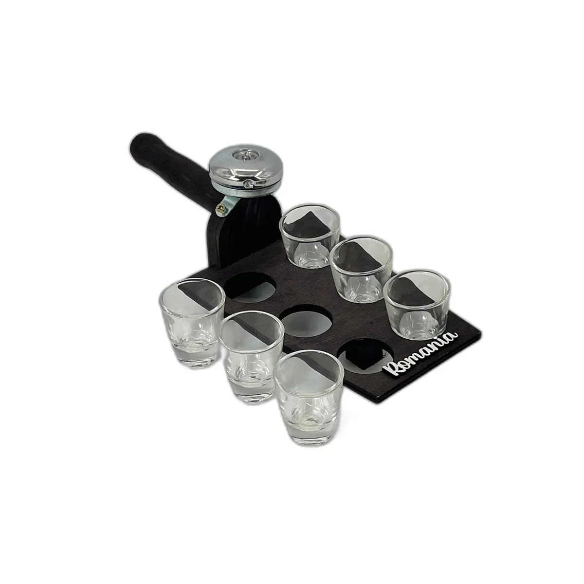 Adauga un plus de traditie si eleganta servind tuica sau alte bauturi fine cu tava decorativa cu clopotel si 6 pahare, avand suport din lemn in stil rustic romanesc. Perfecta pentru pensiuni, cadouri tematice sau evenimente speciale, aceasta tava combina functionalitatea cu un design autentic, creand o experienta memorabila pentru invitati.